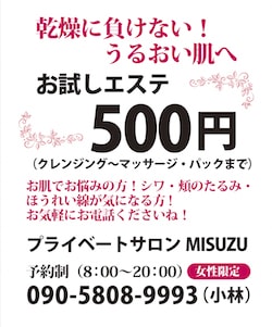エステを身近に感じてほしい、コラーゲン・ミネラル・アミノ酸などの保湿成分を多く含んでいる「MIKIMOTO COSMETICS」の素晴らしさをお肌で感じてほしいという想いで、お試しの500円エステを実施しております。ひとりひとりのお客様を大切にし、ホットしていただける隠れ家的なサロンを目指してまいりたいと思います。